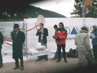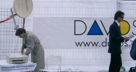 Vor dem Eingang des Kongresszentrums in Davos stellten wir einen Aussenposten des Funkaufklärungssystems ONYX mit einem Faxgerät, Kabelsalat und einer schönen Satellitenschüssel auf. Danach verteilten wir den Passanten unsere vorgefertigten Faxe und versuchten, die Leute in Gespräche zu verwickeln. Unter anderem drückten wir diversen Forumsteilnehmern unsere Zettel in die Hand, zB einer Kuwaitischen Delegation und dem irakischen Aussenminister. Wir hoffen, dass wir mit unserer Aktion nicht allzu grosse diplomatische Verstimmungen auslösen werden, da scheinbar relativ viele der Leute den satirischen Charakter unserer Faxe nicht direkt erkannten.