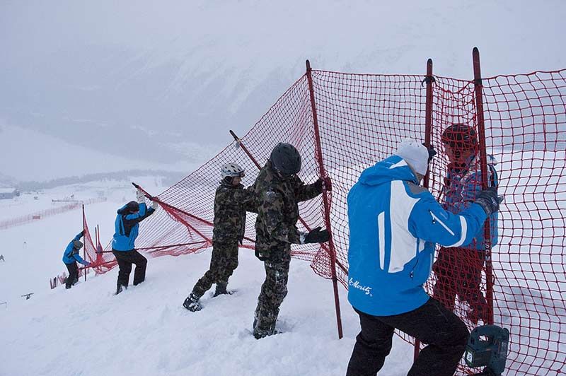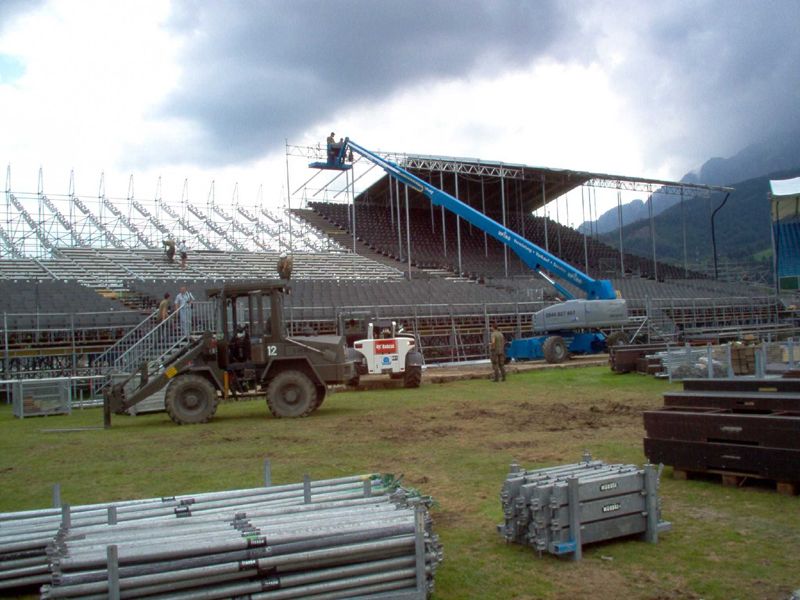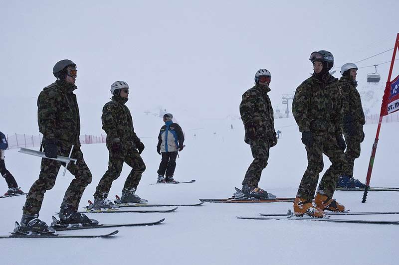 Die Armee bei der Ausübung von sehr wichtigen Staatsaufgaben, die unter keinen Umständen an Private delegiert werden können: Verkehrsregelung an der Euro08 (oben links), Bühnenbau (oben rechts) und Pisten präparieren (unten).